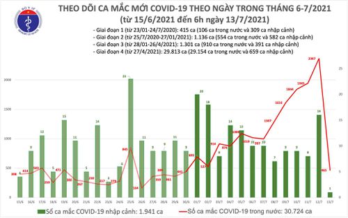 Tính đến 6h ngày 13/7, Việt Nam có tổng cộng 30.724 ca ghi nhận trong nước và 1.941 ca nhập cảnh.