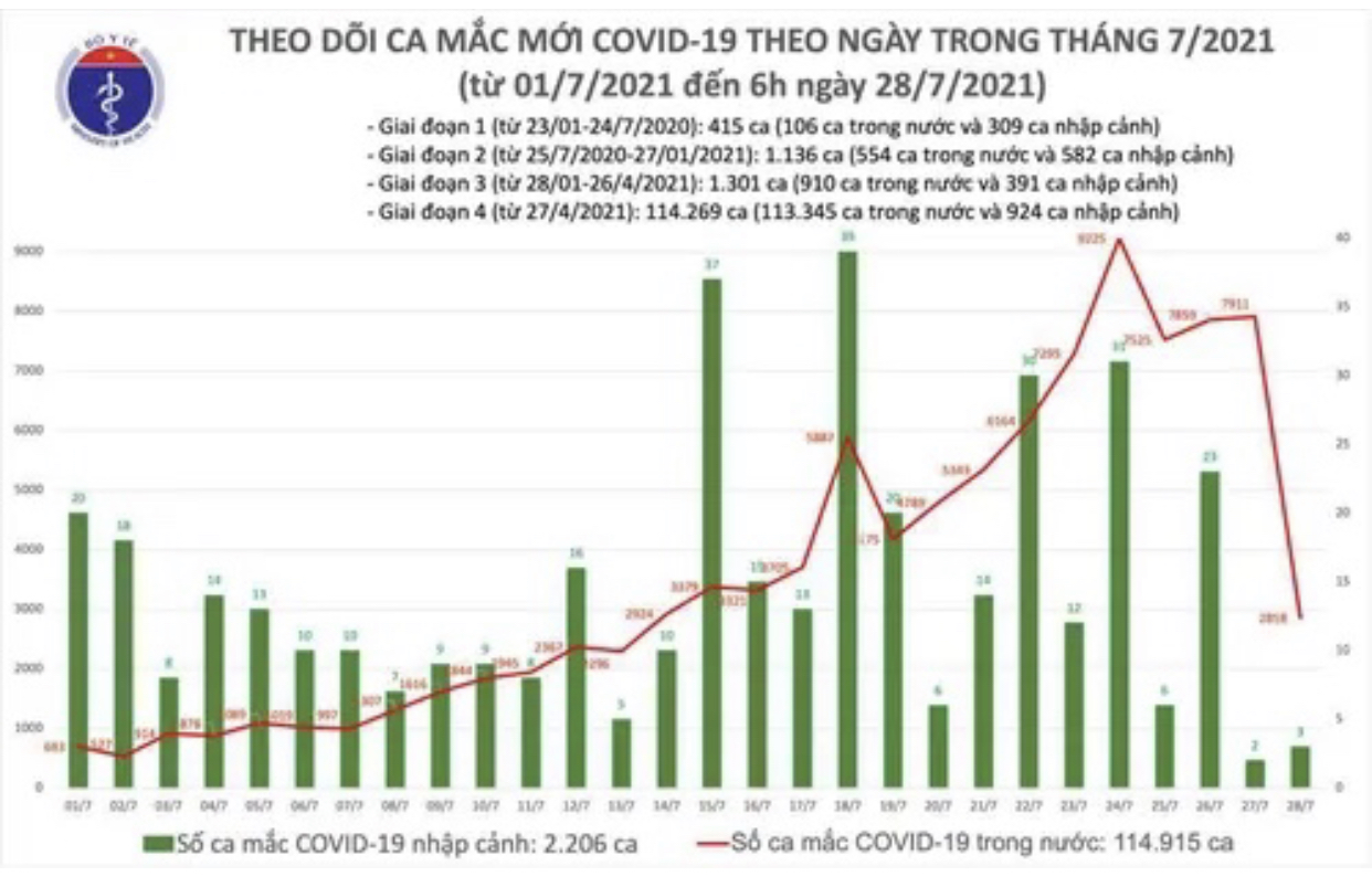 Tính đến sáng ngày 28/7, Việt Nam có tổng 117.121 mắc, trong đó có 2.206 ca nhập cảnh và 114.915 ca mắc trong nước.