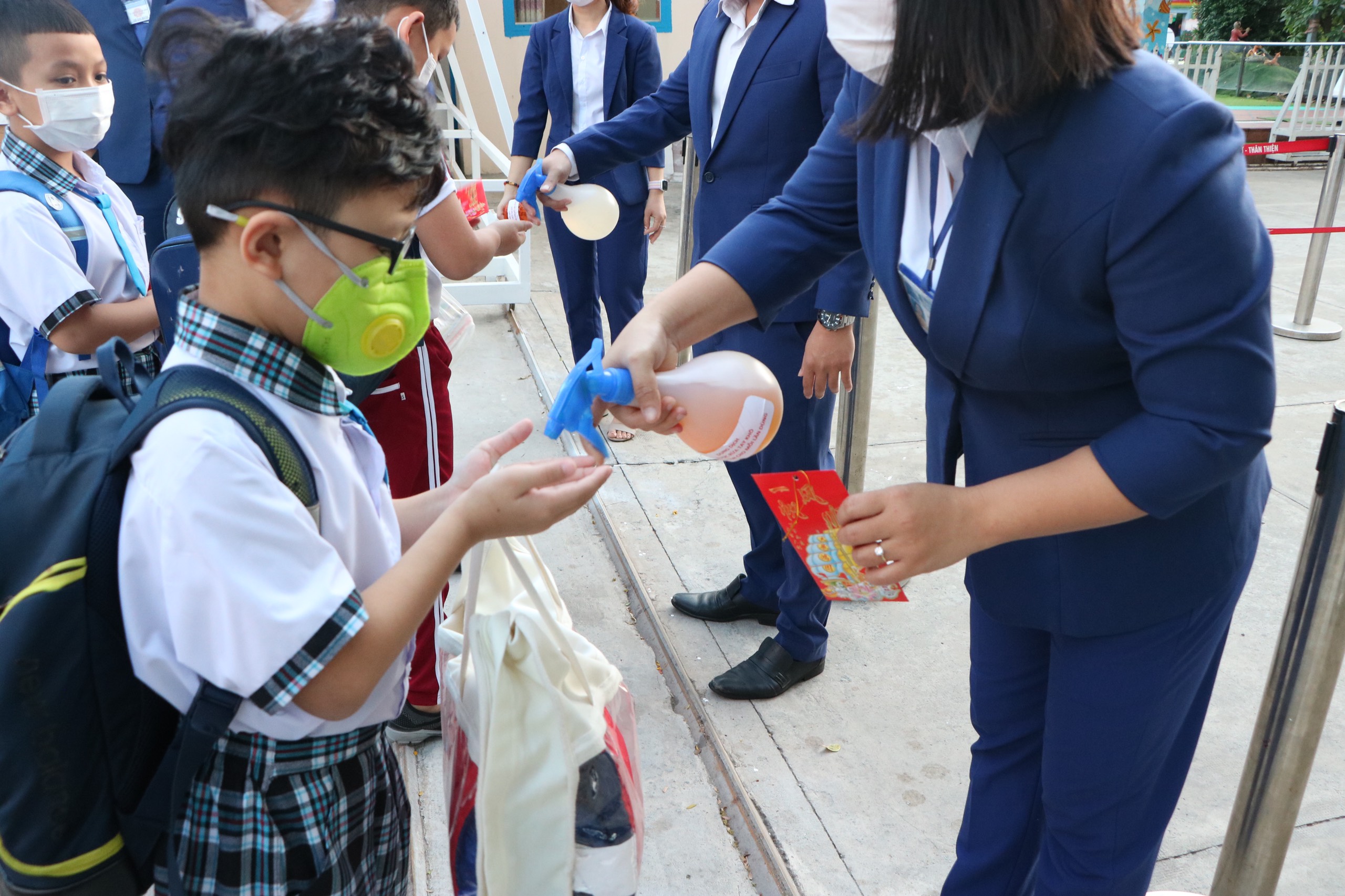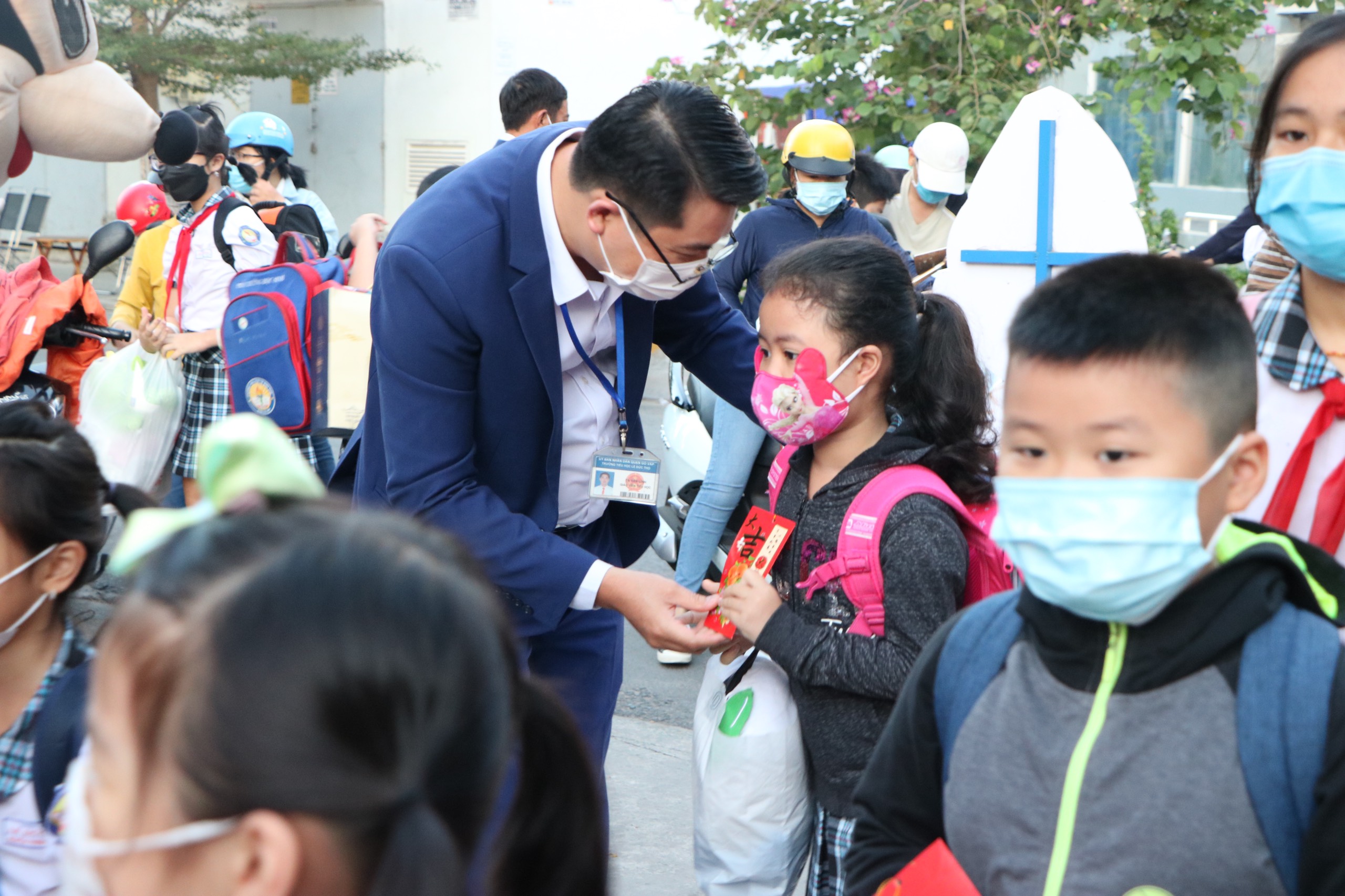 Ghi nhận tại trường Tiểu học Lê Đức Thọ (quận Gò Vấp, TP HCM), nhiều phụ huynh đưa con em đến trường từ rất sớm. Hiệu trưởng cùng cán bộ giáo viên nhà trường đón các em từ cổng để phát bao lì xì, đồng thời hướng dẫn các em xếp hàng đo thân nhiệt và xịt kháng khuẩn vệ sinh tay.