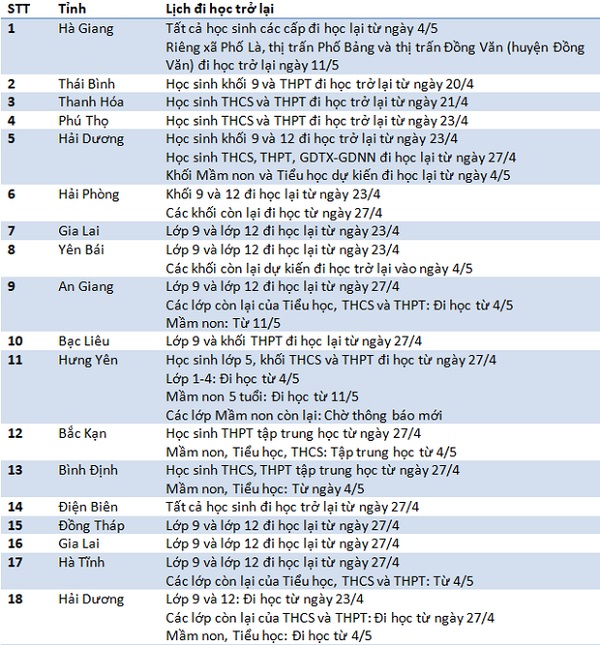 Trong đó, 18 tỉnh, thành cho học sinh các cấp trở lại trường từ hôm nay; hơn 30 địa phương đã cho học sinh THCS, THPT đi học từ cuối tháng 4, hôm nay tiếp tục cho trẻ mầm non, tiểu học đi học trở lại. Hơn 10 tỉnh, thành khác, trong đó có Hà Nội và TP HCM cho trẻ mầm non, tiểu học đến trường muộn hơn.