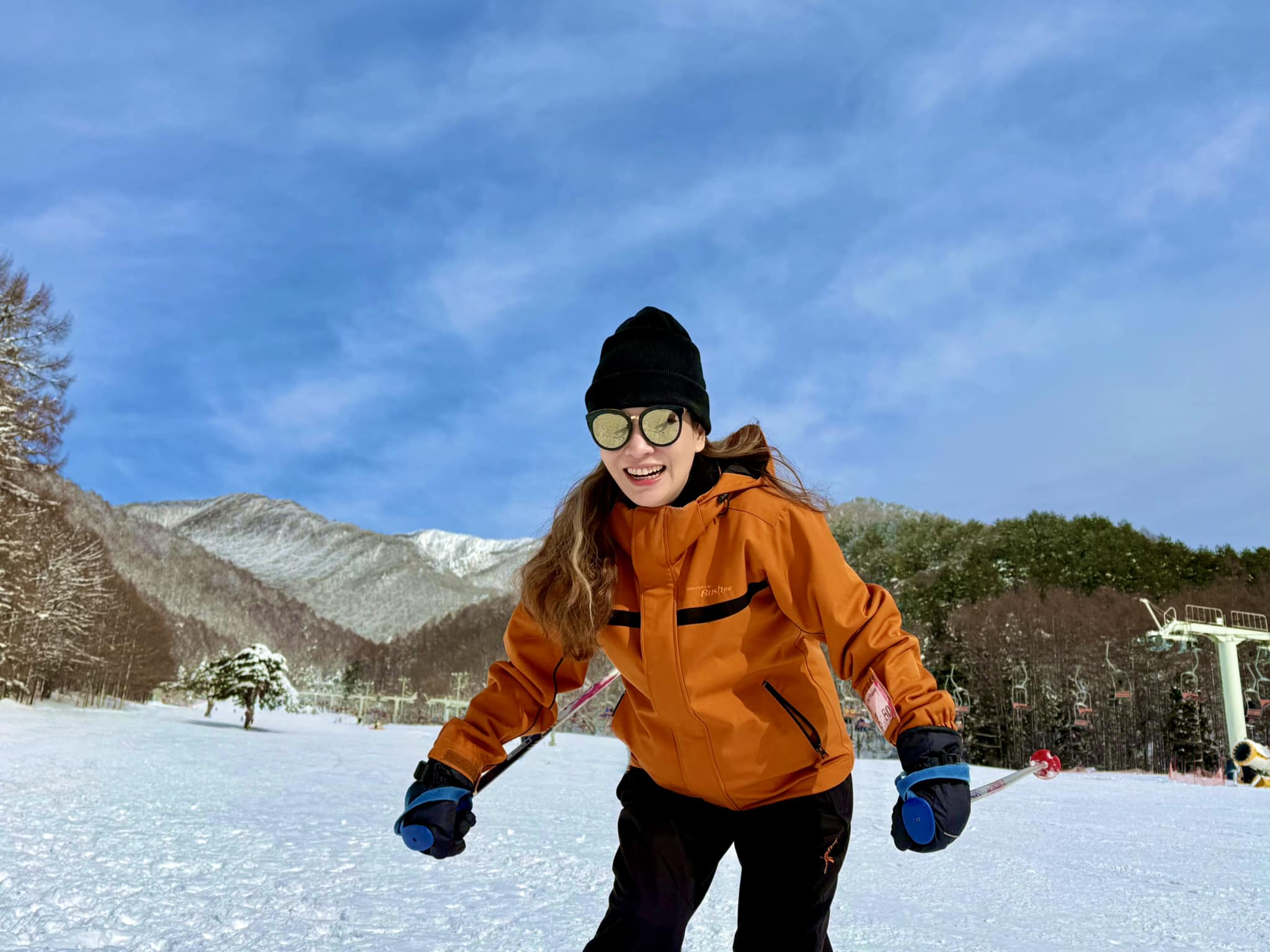 "Trượt tuyết với mình khó kinh khủng khiếp! Dù tập gym, yoga đều đặn, nhưng đứng trên tuyết không giống bất cứ thứ gì mình từng trải qua. Nó trơn một cách vô lý. Đầu gối yếu do giãn dây chằng khiến việc giữ thăng bằng chẳng khác gì đi giày cao gót trên băng", người đẹp chia sẻ.