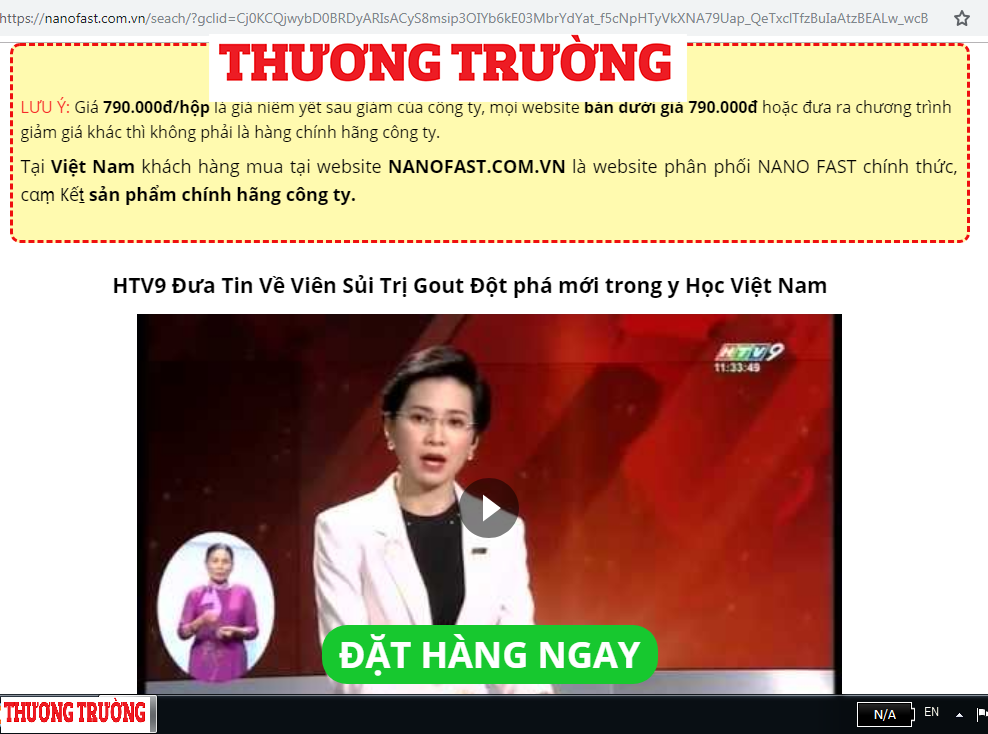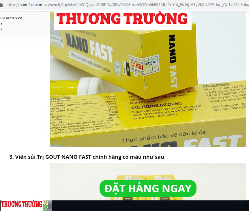 Như Thương Trường đã thông tin tại bài viết: Cẩn trọng với thông tin quảng cáo 2 thực phẩm bảo vệ sức khỏe Tengsu và Nano Fast về việc cổng thông tin điện tử của Cục An toàn thực phẩm (Bộ Y tế) cảnh báo một số website có nội dung quảng cáo sản phẩm Thực phẩm bảo vệ sức khỏe Nano Fast vi phạm quy định quảng cáo https://www.facebook.com/Nano-FastGout;https://www.trigoutnanofast.vn;http://www.viensuinanofast.site/vien_sui_4_4;http://www.nanofast.site/chua_gout_102;http://www.nanofast.pw/nanofast; https://www.goutnanofast.com;https://www.nanofast-chinhhang.com;http://www.kienthucsuckhoedoisong.online.