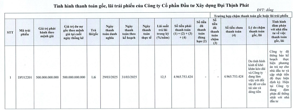 Công ty Cổ phần Đầu tư Xây dựng Đại Thịnh Phát chưa thanh toán tiền lãi trái phiếu do tình hình kinh tế khó khăn và đang làm việc với đối tác để cơ cấu tài sản và dòng tiền...