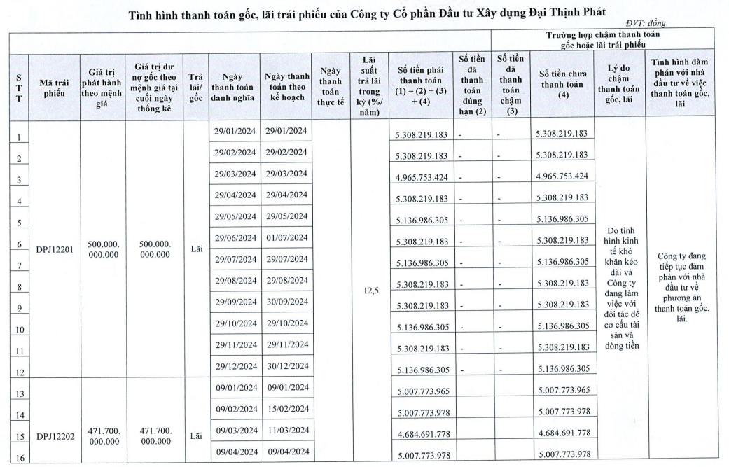 Với tình hình kinh doanh khó khăn, Đại Thịnh Phát cũng không thể thanh toán bất kỳ đợt lãi nào trong năm 2024 cho 2 lô trái phiếu đã phát hành.