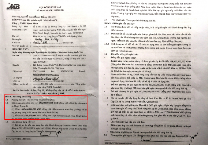 Cụ thể, sau khi Công ty Quan Minh làm việc với ngân hàng MB đã chấp nhận bán một phần dự án để trả nợ trước. Theo đó, ngân hàng MB đồng ý cho công ty ký hợp đồng đặt cọc cho các khách hàng có nhu cầu nhận chuyển nhượng quyền sử dụng đất với điều khoản: ngân hàng MB thu nợ 10 triệu đồng/m2, Công ty Quan Minh được sử dụng 4 triệu đồng/m2 vào thi công, kinh doanh.
