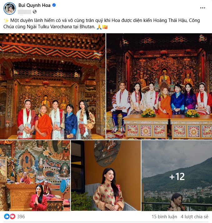 Người đẹp viết: "Một duyên lành hiếm có và vô cùng trân quý khi Hoa được diện kiến Hoàng Thái Hậu, Công Chúa cùng Ngài Tulku Varochana tại Bhutan."