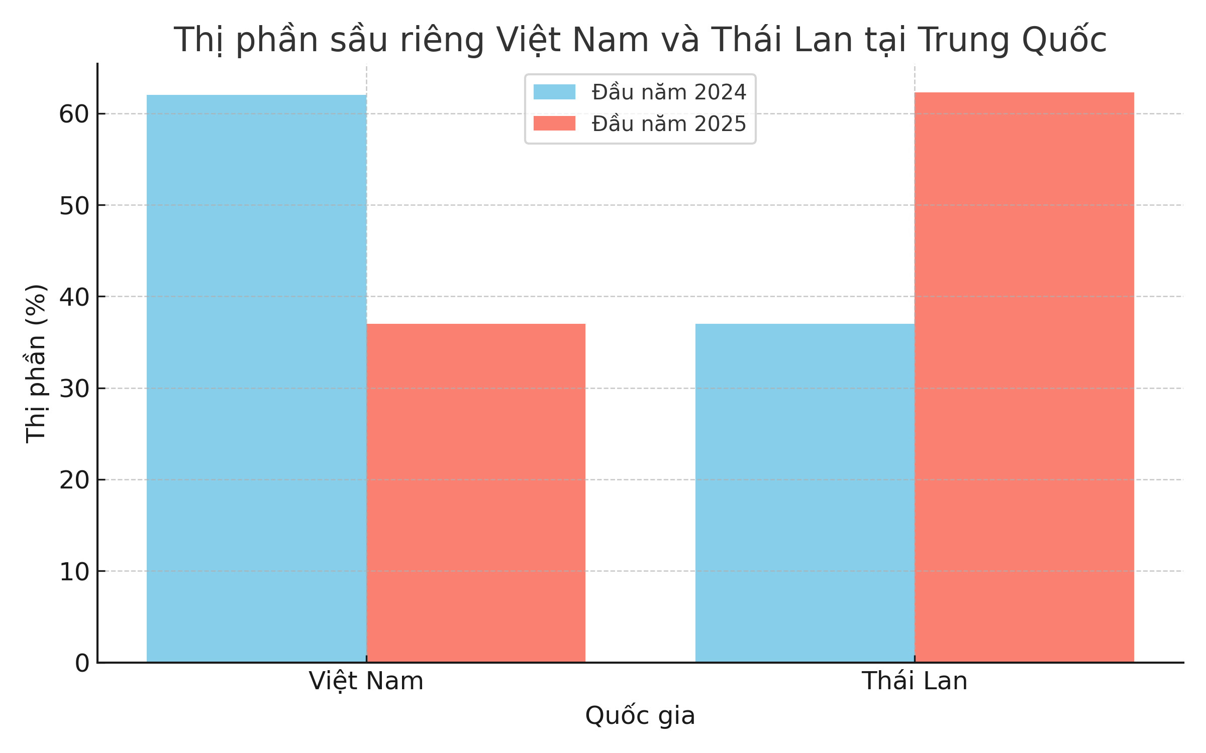 Hai tháng đầu năm, xuất khẩu sầu riêng sang Trung Quốc ghi nhận mức sụt giảm mạnh: doanh thu chỉ đạt 27 triệu USD, giảm tới 83% so với cùng kỳ 2024. Thị phần sầu riêng Việt tại Trung Quốc cũng lao dốc từ 62% xuống còn 37%, trong khi Thái Lan đã vươn lên chiếm 62,3% thị phần.