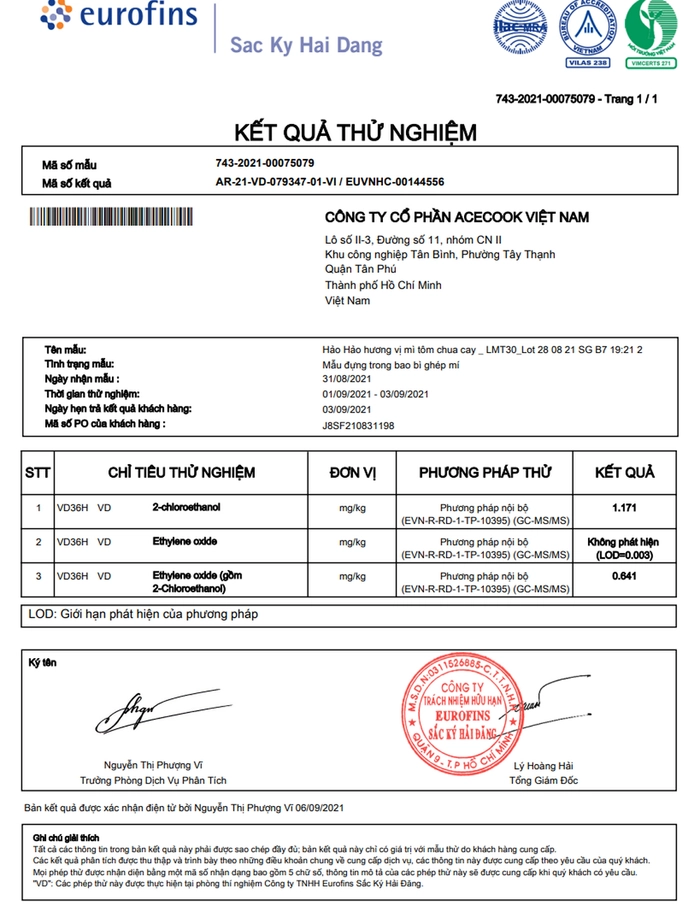 Theo kết quả thử nghiệm của Trung tâm phân tích Eurofins, sản phẩm Hảo Hảo tôm chua cay nội địa không có chất EO và có sự hiện diện của một lượng rất nhỏ 2-chloroetanol (2- CE) với hàm lượng 1,17 ppm.