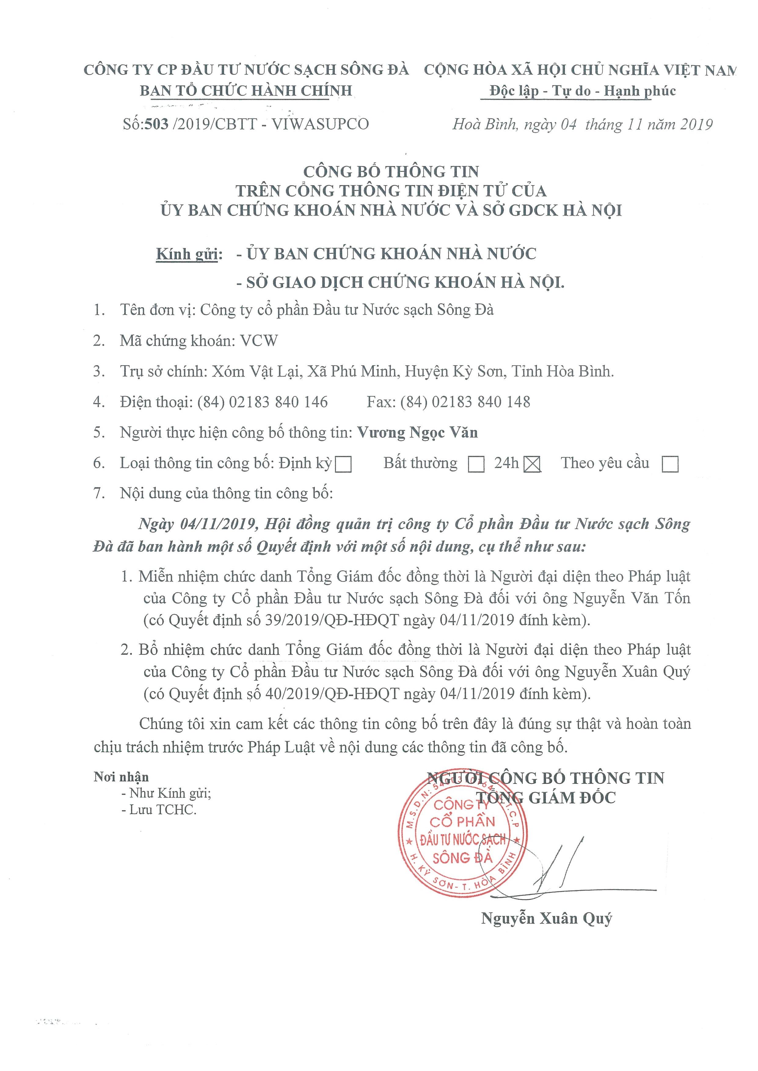 Cụ thể, Công ty này thông tin, ngày 4/11/2019, Hội đồng quản trị Công ty CP Đầu tư nước mặt Sông Đà đã ban hành một số quyết định miễn nhiệm chức danh Tổng giám đốc đồng thời là người đại diện theo pháp luật của Công ty CP Đầu tư nước Sông Đà đối với ông Nguyễn Văn Tốn.