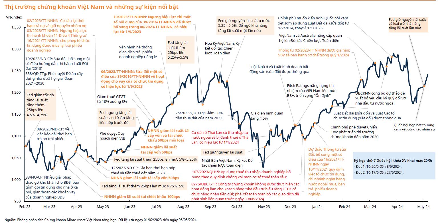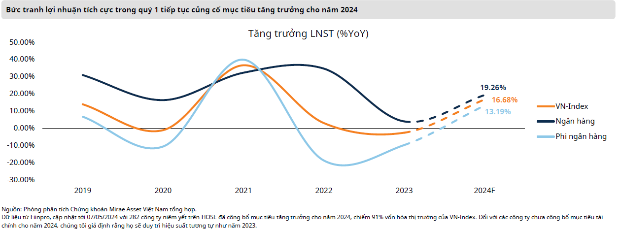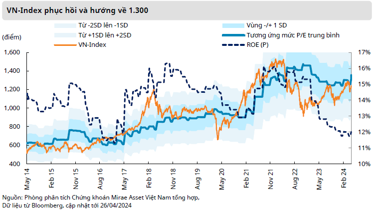 Theo nhận định của Chứng khoán Mirae Asset Việt Nam, tăng trưởng lợi nhuận trong quý 1 đã góp phần củng cố nhịp phục hồi và tiếp diễn xu hướng tăng trong tháng 5. VN-Index được kỳ vọng có thể sớm quay trở lại khu vực 1.300 điểm. Tuy nhiên, nhịp phục hồi này dự kiến sẽ đi kèm với những biến động điều chỉnh ngắn hạn để đánh giá lại phạm vi 1.200 đến 1.220 điểm trước khi tiếp tục xu hướng tăng.