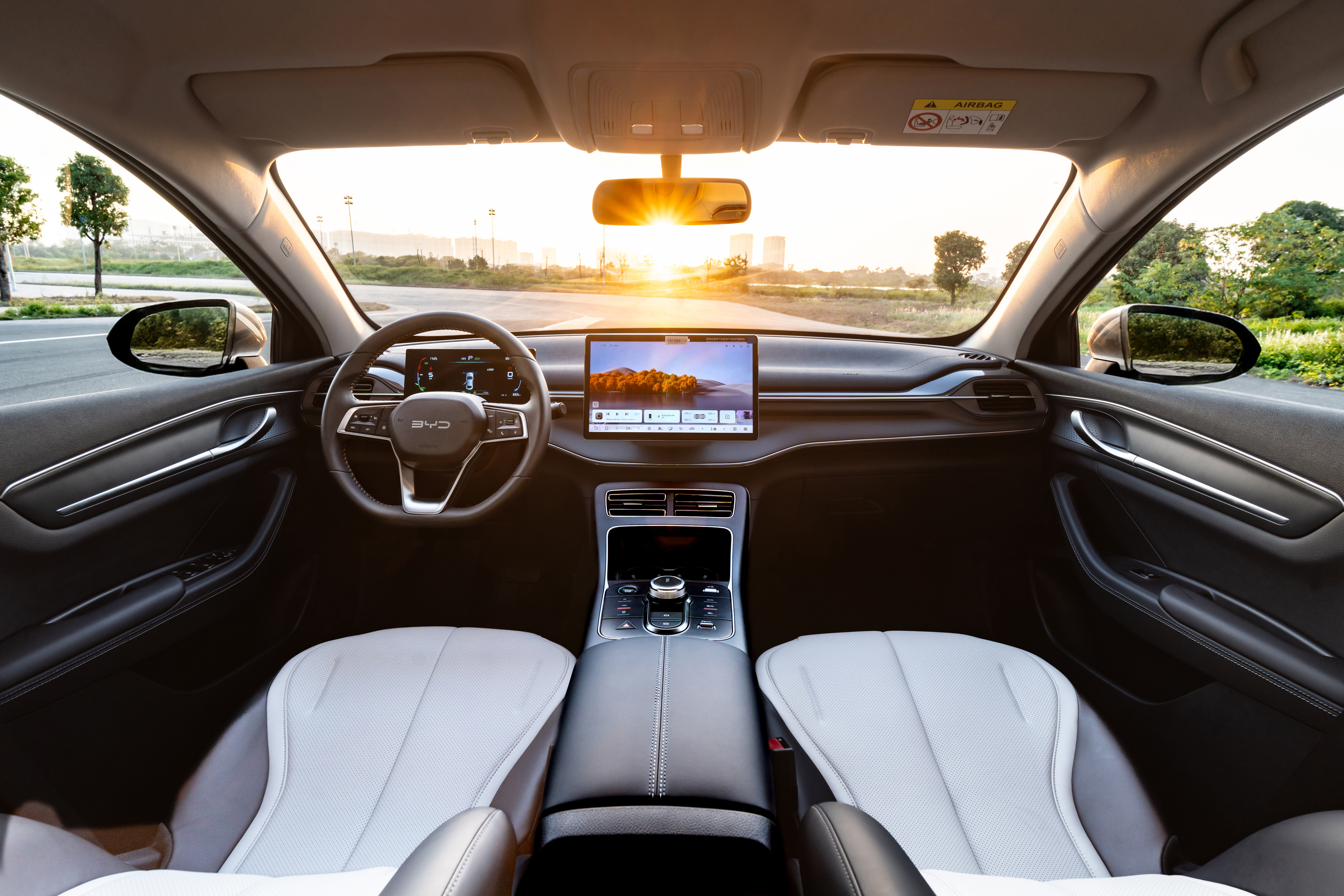 Nội thất xe sở hữu một số trang bị nổi bật gồm: Màn hình trung tâmm 12,8 inch, cụm đồng hồ LCD 8,8 inch, ghế lái chỉnh điện 6 hướng, ghế phụ chỉnh điện 4 hướng, điều hòa tự động 1 vùng, lọc không khí PM2.5, cần số điện tử, điều khiển dạng núm xoay, sạc không dây, gạt mưa tự động, camera 360 độ..... Đáng chú ý, xe có khả năng mở khóa bằng thẻ NFC và ứng dụng BYD App.