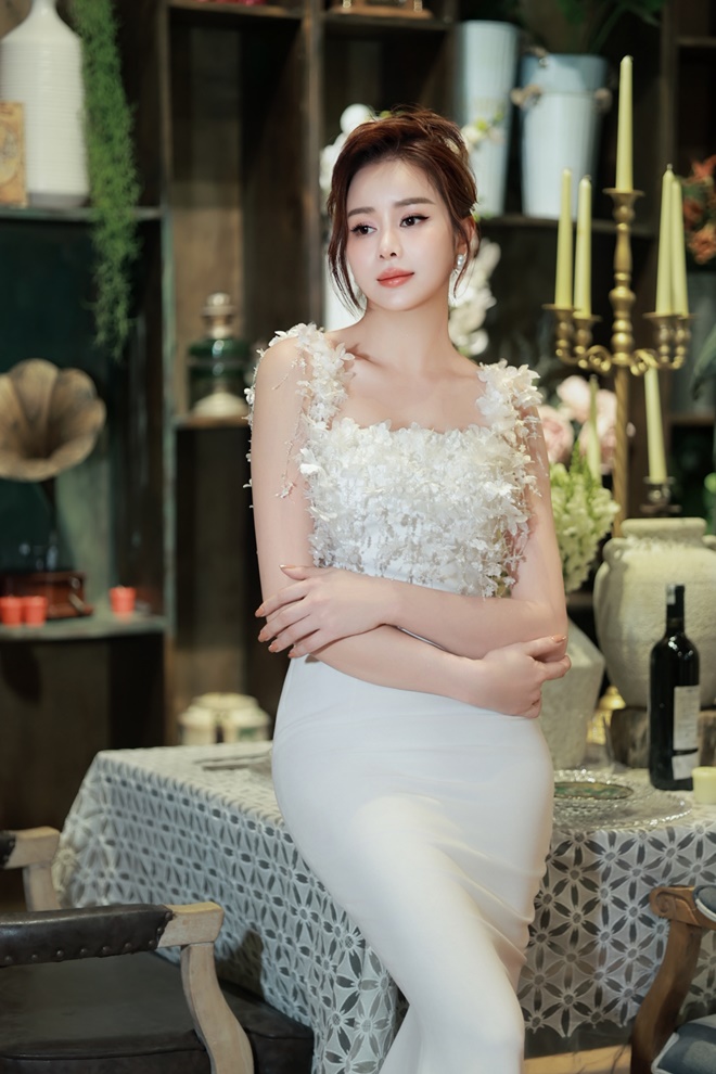 Bộ thứ tư lại mang sắc thái của một quý cô thời thượng với chiếc đầm ôm dài được đính kết hoa 3D tỉ mỉ ở phần thân trên. Kiểu tóc búi gọn, lớp trang điểm tinh giản giúp tôn đường nét gương mặt, thể hiện vẻ đẹp của sự tự tin và bản lĩnh.