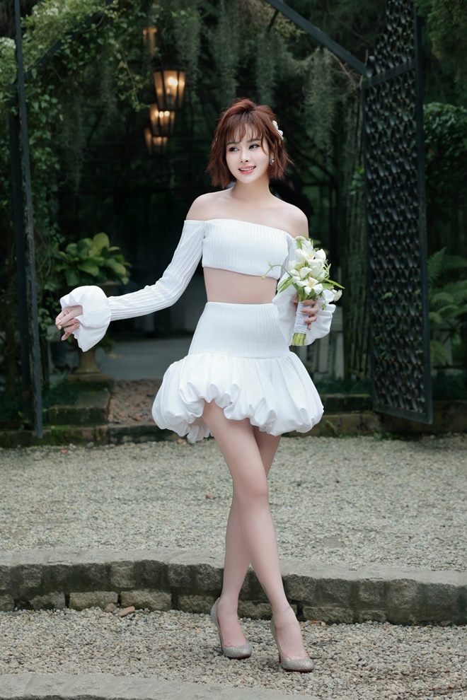 Ở bộ đầu tiên, cô xuất hiện với vẻ ngọt ngào và tươi trẻ trong thiết kế áo croptop trễ vai phối chân váy xòe nhẹ bằng chất liệu gân dệt tinh tế. Mái tóc ngắn uốn nhẹ cùng phụ kiện hoa trắng cài khéo léo tôn lên nét thanh thoát, tinh khôi.