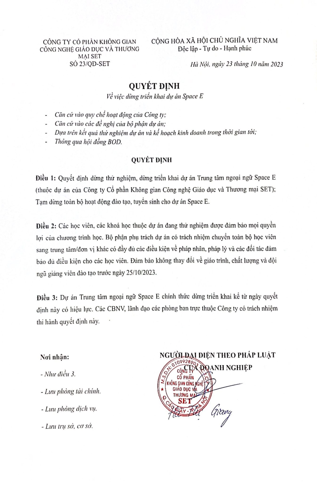 Quyết định dừng hoạt động của dự án Trung tâm ngoại ngữ Space E.