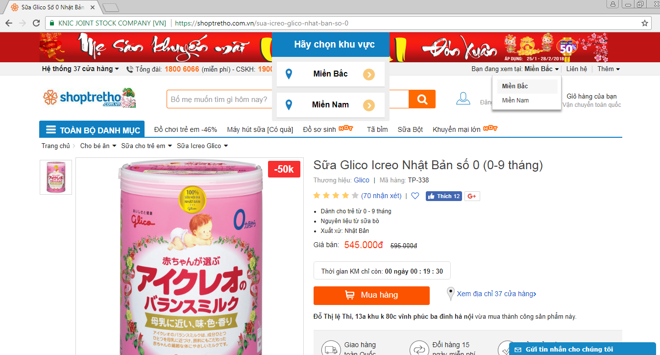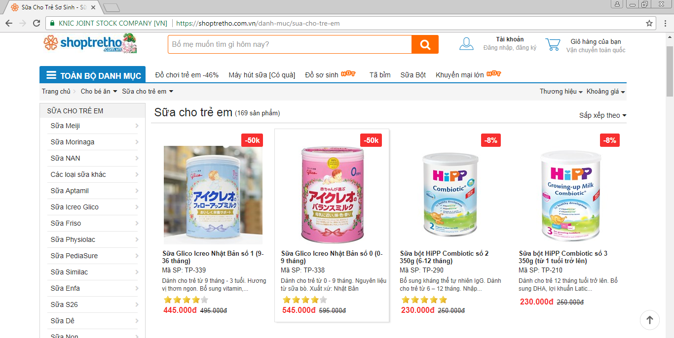 Cụ thể, trên trang thương mại điện tử shoptretho.com.vn đăng tải sản phẩm sữa Glico Icreo Nhật Bản số 0 (0-9 tháng) dành cho trẻ nhỏ từ 0 đến 9 tháng tuổi. Sản phẩm này được DN niêm yết giá bán 595 nghìn đồng/hộp và được giảm giá 50 nghìn đồng xuống còn 545 nghìn đồng/hộp.