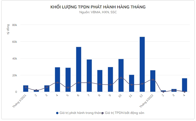 Nhưng khối lượng trái phiếu của doanh nghiệp bất động sản trong tháng 4 đã giảm mạnh sau khi Thủ tướng yêu cầu Bộ Tài chính và Uỷ ban Chứng khoán thanh tra, giám sát việc phát hành, đầu tư, phân phối, giao dịch và sử dụng vốn thu được từ phát hành trái phiếu. Chỉ đạo được Thủ tướng đưa ra ngày 7/4, hai ngày sau khi Bộ Công an khởi tố, bắt tạm giam Chủ tịch Tập đoàn Tân Hoàng Minh vì tội Lừa đảo chiếm đoạt tài sản liên quan đến hoạt động phát hành trái phiếu.
