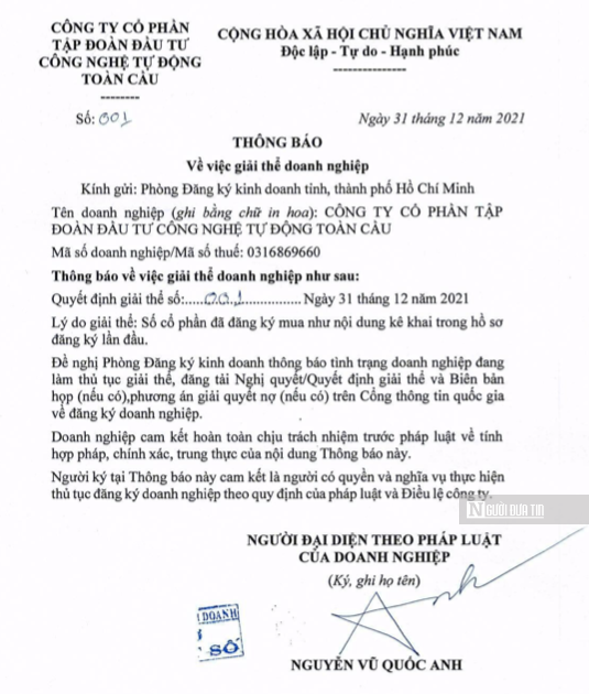 Quyết định giải thể doanh nghiệp được ký ngày 31/12/2021 bởi ông Nguyễn Vũ Quốc Anh, người đại diện theo pháp luật đồng thời là giám đốc công ty. Một tuần sau, Cổng thông tin quốc gia về đăng ký doanh nghiệp cập nhật thông tin này.