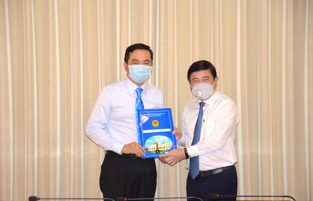 Chủ tịch UBND TP HCM Nguyễn Thành Phong trao quyết định bổ nhiệm cho tân Giám đốc Sở Công Thương thành phố Bùi Tá Hoàng Vũ (bên trái). Ảnh: Cổng TT TP.HCM.