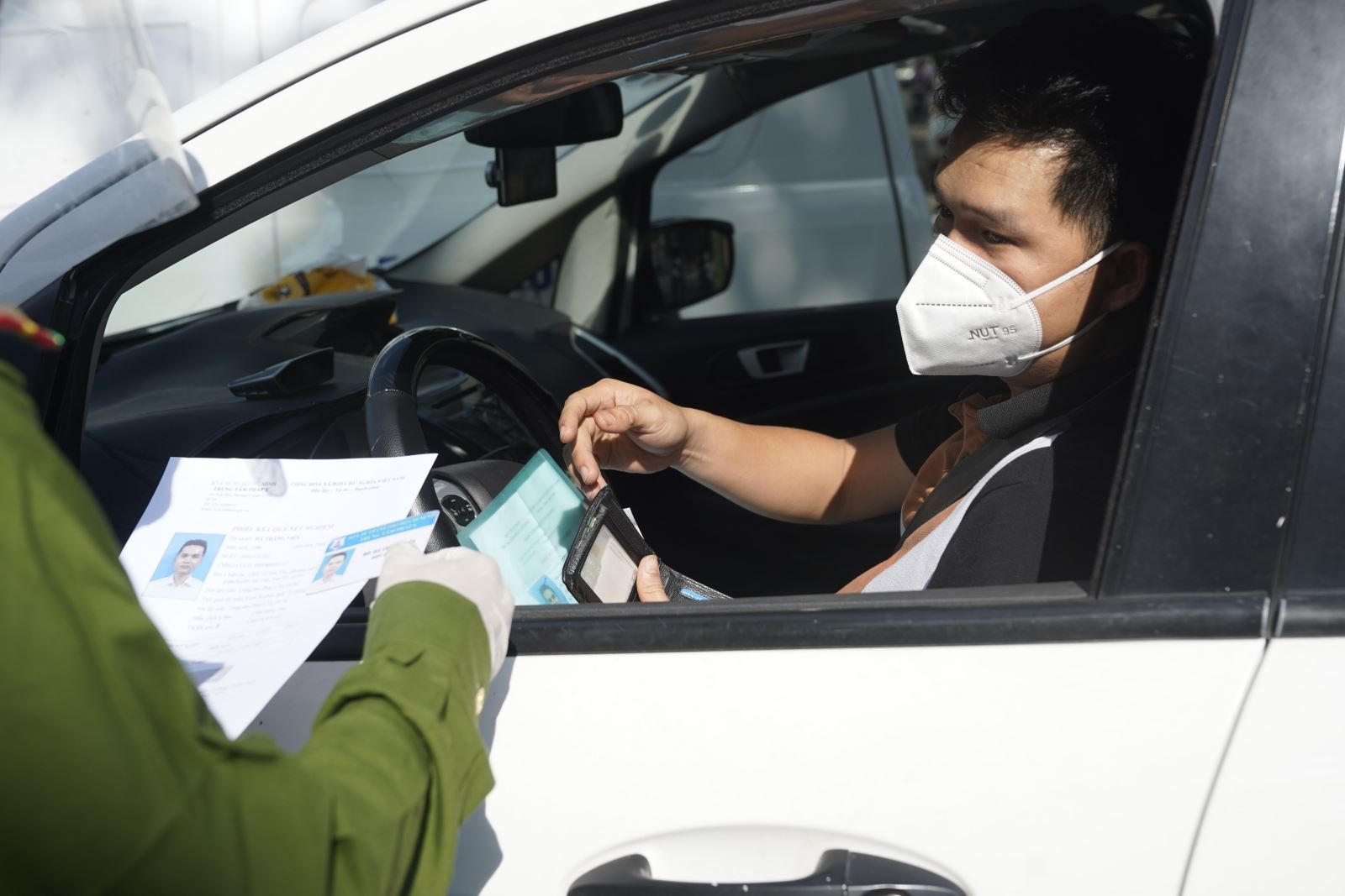Công an kiểm tra giấy nhận diện của các tài xế xe chở hàng.