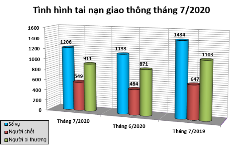 Về tình hình tai nạn giao thông, trong tháng 7/2020, toàn quốc xảy ra 1.206 vụ, làm chết 549 người, bị thương 911 người. So với tháng 6/2020, tăng 73 vụ (+6,44%); tăng 65 người chết (+13,43%); tăng 40 người bị thương (+4,59%).