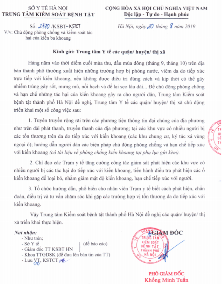 Theo công văn cảnh báo, hằng năm vào cuối mùa thu, đầu mùa đông (tháng 9, tháng 10) trên địa bàn thành phố Hà Nội thường xuất hiện những trường hợp bị phóng nước, viêm da do tiếp xúc trực tiếp với kiến ba khoang, nếu không được điều trị đúng cách và kịp thời có thể gây nhiễm trùng, gây sốt, mưng mủ, nổi hạch…