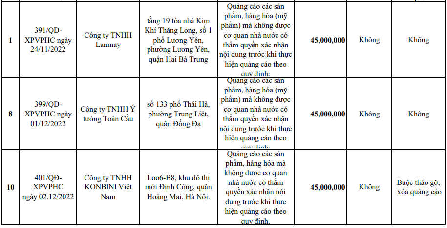 Danh sách các công ty bị xử phạt do vi phạm quảng cáo sản phẩm, hàng hóa