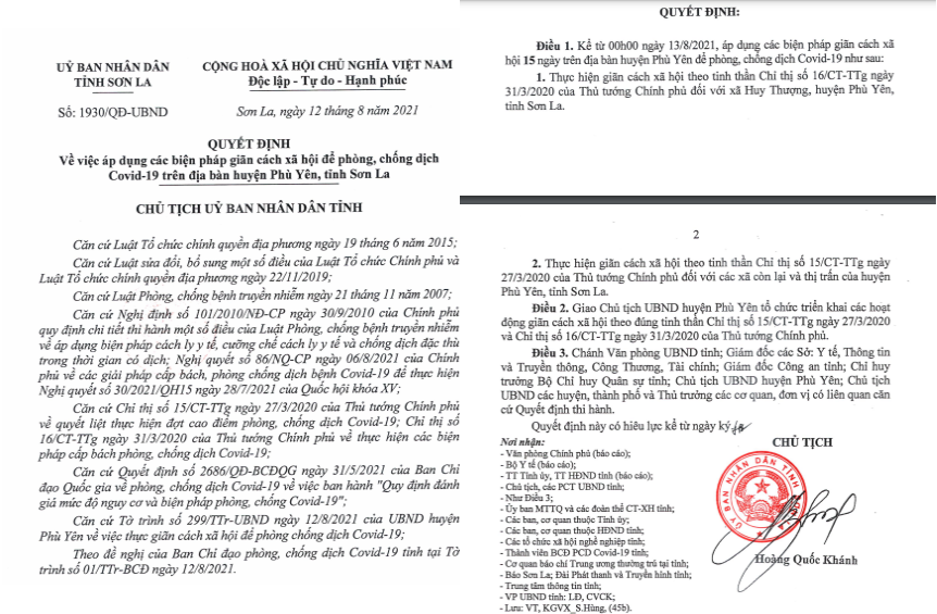 Chủ tịch UBND tỉnh Sơn La Hoàng Quốc Khánh vừa ký văn bản về việc áp dụng các biện pháp giãn cách xã hội để phòng, chống dịch Covid-19 trên địa bàn huyện Phù Yên.