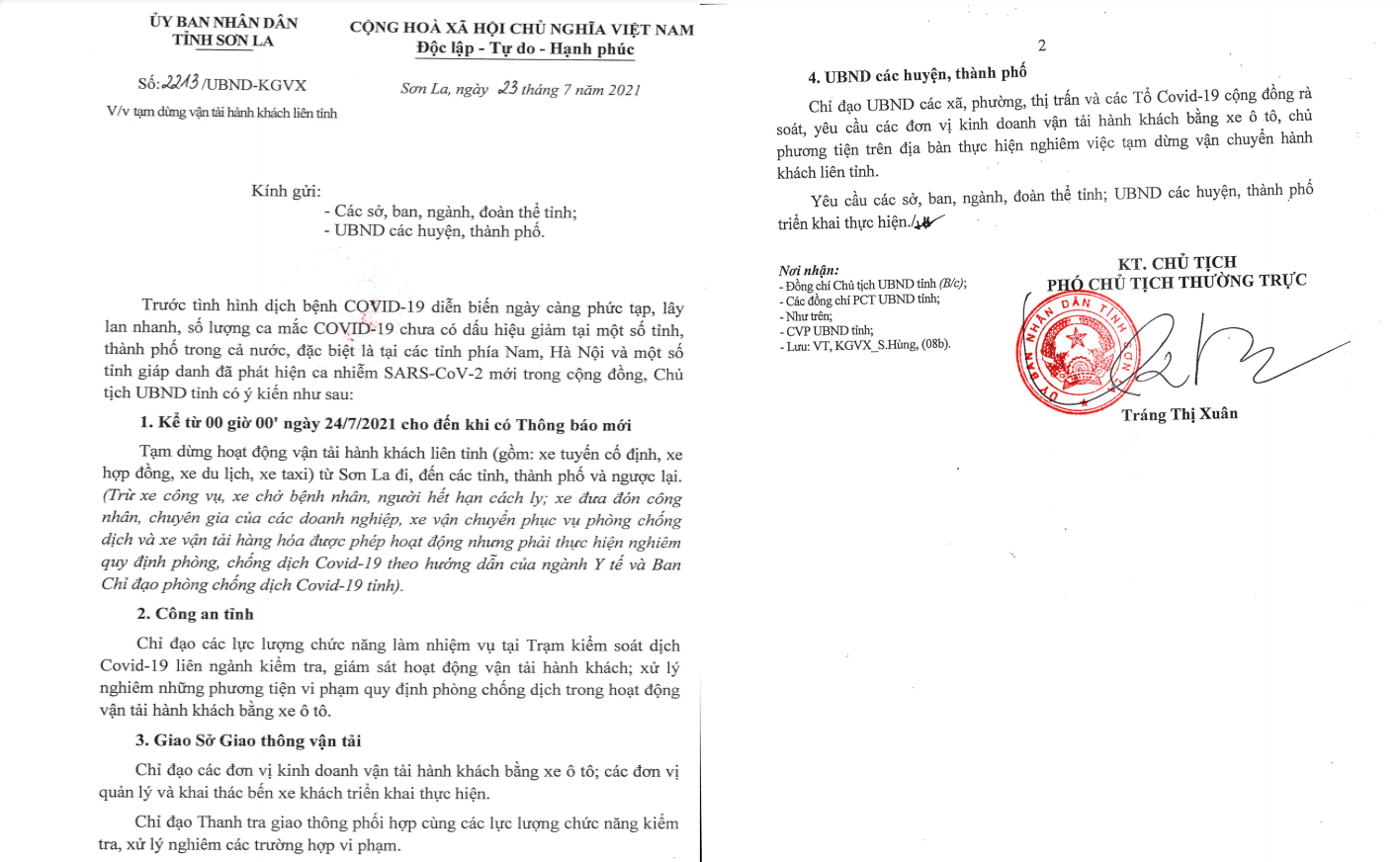 UBND tỉnh Sơn La đã quyết định tạm dừng hoạt động vận tải hành khách liên tỉnh (gồm xe tuyến cố định, xe hợp đồng, xe du lịch, xe taxi) từ Sơn La đi, đến các tỉnh, thành phố và ngược lại (Trừ xe công vụ, xe chở bệnh nhân, người hết hạn cách ly, xe đưa đón công nhân, chuyên gia của các doanh nghiệp, xe vận chuyển phục vụ phòng chống dịch và xe vận tải hàng hóa được phép hoạt động nhưng phải thực hiện nghiêm quy định phòng, chống dịch Covid-19 theo hướng dẫn của ngành Y tế và Ban chỉ đạo phòng chống dịch Covid-19 tỉnh), thời gian áp dụng kể từ 0hngày 24/7/2021 cho đến khi có thông báo mới.