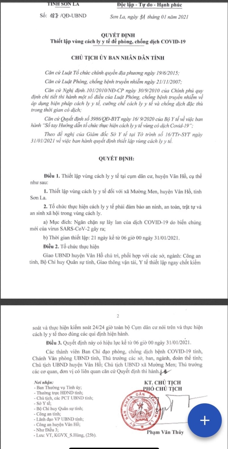 Ngày 31/1, Chủ tịch UBND tỉnh Sơn La đã có các Quyết định số 187/QĐ-UBND và số 188/QĐ-UBND thiết lập vùng cách ly y tế để phòng, chống dịch COVID-19 tại cụm dân cư đối với xã Mường Men, huyện Vân Hồ và bản Suối Bi, xã Mường Cơi, huyện Phù Yên, nhằm ngăn chặn sự lây lan của dịch COVID-19 do biến chủng mới của SARS-CoV-2 gây ra.