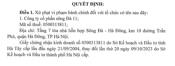 Theo Quyết định số 86916/QĐ-CTHN-TTKT10-XPHC ngày 11/12/2023 của Cục thuế Thành phố Hà Nội, CTCP Sông Đà 11 (SJE) vừa bị phạt về các vi phạm liên quan đến kê khai thuế. Cụ thể, trong quá trình kiểm tra, Công ty này đã kê khai sai về hóa đơn mua từ NNT không còn hoạt động tại địa chỉ trụ sở đã đăng ký với cơ quan thuế. Điều này đã làm ảnh hưởng đến quyền khấu trừ thuế giá trị gia tăng đầu vào của doanh thu chưa chịu thuế.