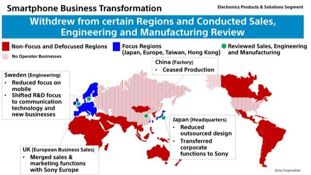 Theo biểu đồ mà Sony đưa ra, vùng màu đỏ đậm (Non-Focus and Defocused Regions) sẽ là những nơi mà Sony giảm sự tập trung hoặc rút hoàn toàn mảng kinh doanh smartphone của mình.