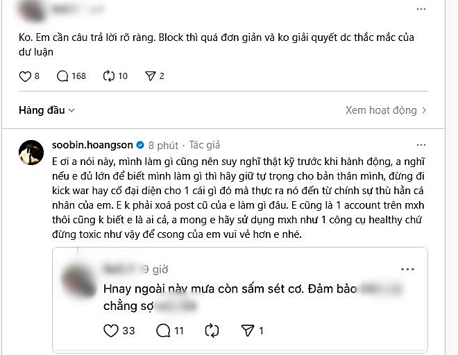 Sau đêm concert đầy cảm xúc, Soobin đã đăng tải bài viết trên Threads để hỏi thăm các Gai Con, chia sẻ sự quan tâm đến fan sau những giờ đồng hành dưới mưa. Đáng chú ý, nam ca sĩ còn hài hước nhắc lại khoảnh khắc cởi áo khiến người hâm mộ “hú hét” trong đêm diễn. Bài đăng nhanh chóng gây bão mạng xã hội khi Soobin thẳng thắn đáp trả một antifan, khiến dân mạng không khỏi thích thú trước màn đối đáp vừa chất vừa dí dỏm.