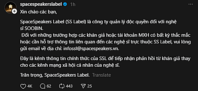 Trước loạt tranh luận trái chiều liên quan đến Soobin, công ty quản lý SSL đã chính thức lên tiếng. Đại diện công ty mong muốn khán giả và người hâm mộ, nếu có bất kỳ vấn đề nào liên quan đến nghệ sĩ, hãy liên hệ trực tiếp với công ty để được giải đáp, thay vì tranh luận công khai.