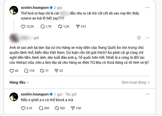 Tuy nhiên có một antifan chất vấn nam ca sĩ về việc hợp tác với thương hiệu xe điện Trung Quốc. Không né tránh, Soobin đáp trả trực diện: “Nếu em không thích thì có thể block anh mà”.