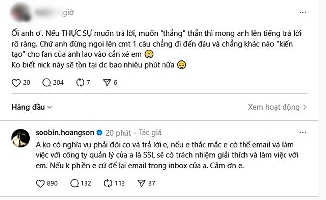 Trước yêu cầu được giải thích rõ ràng, Soobin khẳng định không có nghĩa vụ đôi co: “Nếu em thắc mắc, em có thể email và làm việc với công ty quản lý của anh là SSL. Nếu không phiền, em cứ để lại email trong inbox của anh. Cảm ơn em.”