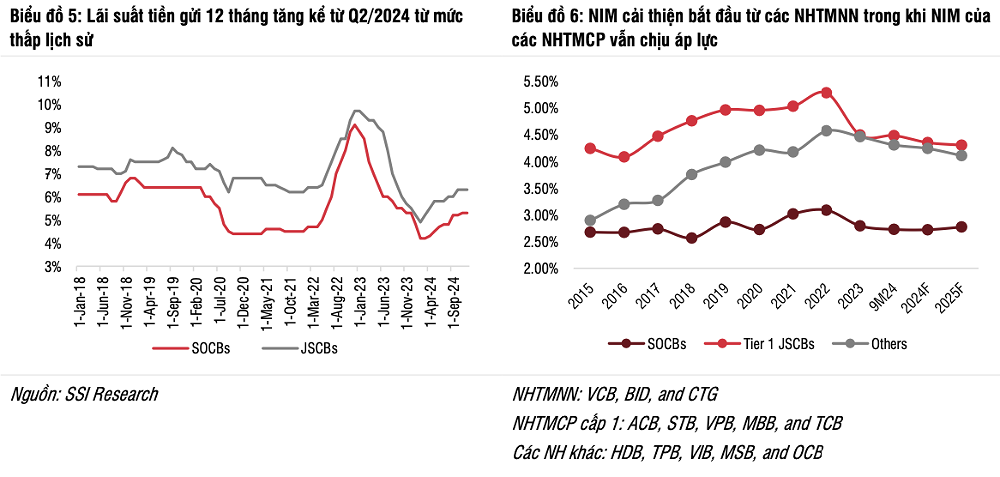 Lãi suất huy động kỳ hạn 12 tháng được dự báo tăng nhẹ, khiến chi phí vốn tăng thêm 0,17 điểm %. SSI dự đoán NIM của ngành sẽ duy trì ổn định ở mức 3,48%, với sự khác biệt rõ rệt: NIM của các ngân hàng quốc doanh tăng lên 2,77% (tăng 0,05 điểm %), trong khi NIM của các ngân hàng thương mại cổ phần giảm xuống 4,24% (giảm 0,07 điểm %).