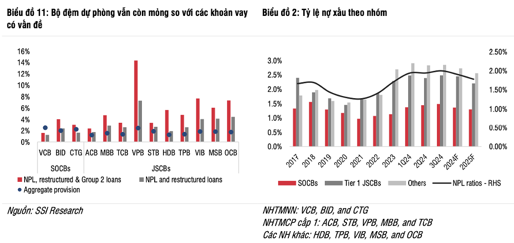 SSI dự báo tỷ lệ nợ xấu của các ngân hàng giảm xuống 1,9% cuối năm 2024, nhờ các biện pháp đẩy mạnh xử lý nợ xấu. Tuy nhiên, tỷ lệ nợ xấu vẫn cần theo dõi chặt chẽ, do hiện ở mức 2% (quý III/2024), tập trung ở các ngành như vật liệu xây dựng, xây dựng, bất động sản, thương mại và sản xuất.