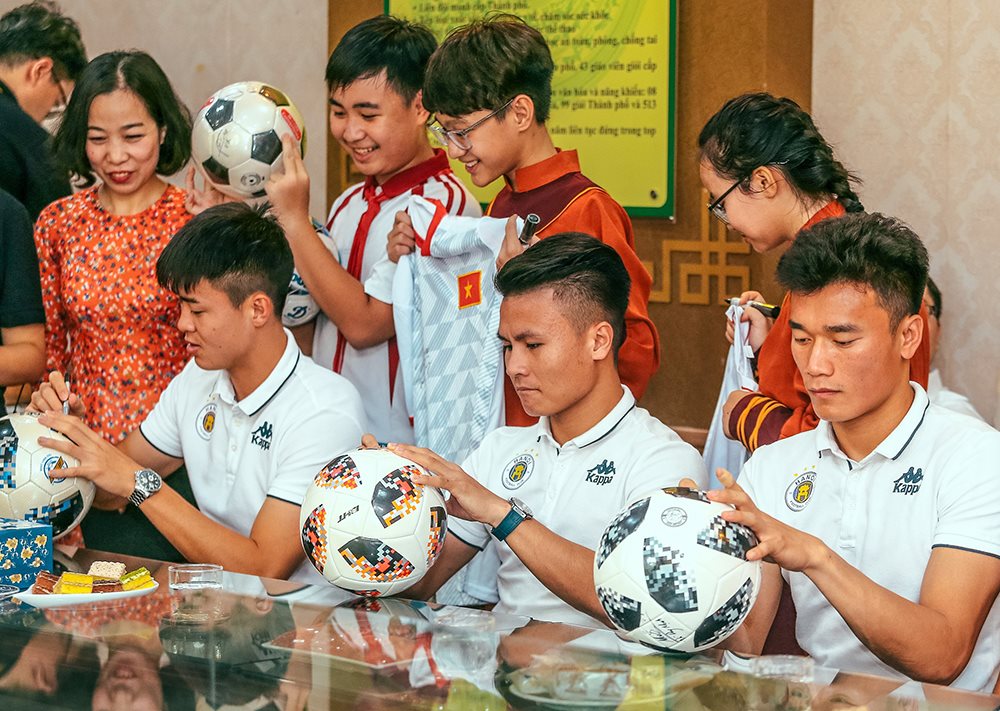 Duy Mạnh, Quang Hải, Bùi Tiến Dũng ký tặng các fan tại trường THCS Nam Trung Yên.Không chỉ các cầu thủ mà các em học sinh cũng hết sức vui mừng, ấn tượng với các cầu thủ tài năng từ CLB Bóng đá Hà Nội. “Chúng em từng nghĩ rằng mình chỉ có thể thấy các anh cầu thủ thần tượng qua tivi thôi, nhưng thật không thể tin được, có ngày em được gặp gỡ và giao lưu trực tiếp với các anh. Thông qua những câu chuyện các anh kể, chúng em có thêm những động lực để duy trì ước mơ. Em cũng rất đam mê bóng đá và mong muốn một ngày nào đó có thể khoác áo đội tuyển Việt Nam” - em Minh Huy trường THCS Việt Nam - Algieria cho biết.