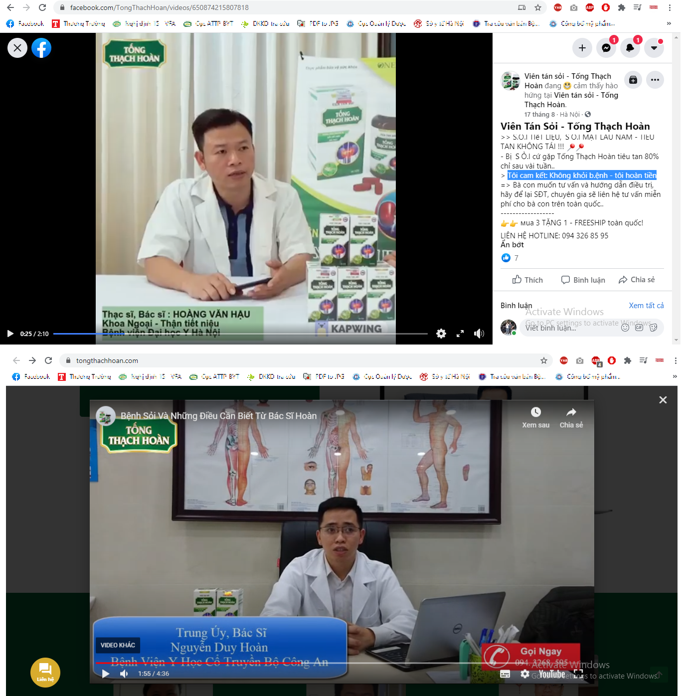 Để lấy lòng tin của người bệnh, tại các website kể trên đã sử dụng hình ảnh, quảng cáo thực phẩm dưới hình thức bài viết, video của bác sĩ Nguyễn Duy Hoàn (giới thiệu là bác sĩ công tác tại Bệnh viện Y học cổ truyền Bộ Công An) để tư vấn, truyền đạt nội dung mô tả sản phẩm TPBVSK Viên tán sỏi Tống thạch hoàn có tác dụng điều trị bệnh sỏi.