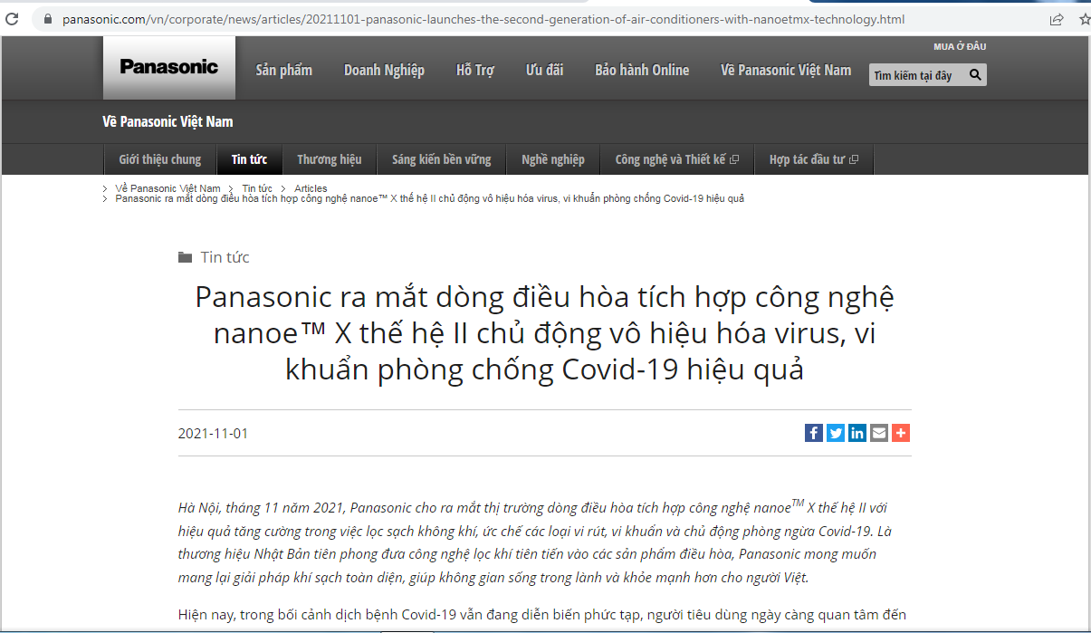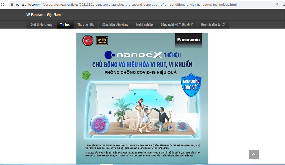 Theo nội dung quảng cáo của tại https://www.panasonic.com, tháng 11/2021 Panasonic cho ra mắt thị trường dòng điều hòa tích hợp công nghệ Nanoe™ X thế hệ II với hiệu quả tăng cường trong việc lọc sạch không khí, ức chế các loại vi rút, vi khuẩn và chủ động phòng ngừa Covid-19. Là thương hiệu Nhật Bản tiên phong đưa công nghệ lọc khí tiên tiến vào các sản phẩm điều hòa, Panasonic mong muốn mang lại giải pháp khí sạch toàn diện, giúp không gian sống trong lành và khỏe mạnh hơn cho người Việt.