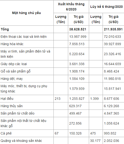 Các mặt hàng New Zealand nhập khẩu từ nước ta trong tháng 6/2020 và 6 tháng đầu năm 2020. Nguồn: Tổng cục Hải Quan.
