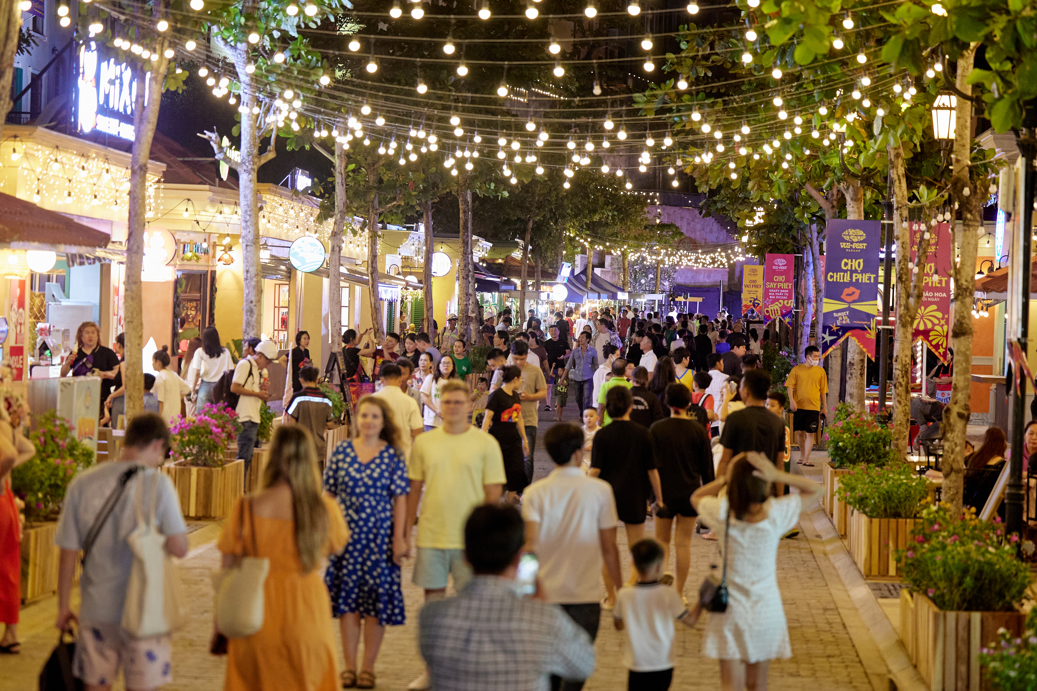 Nằm tại thị trấn Hoàng Hôn Sunset Town, Chợ đêm sáng tạo Vui Phết - Vui-Fest Bazaar không chỉ là điểm hẹn cho những tín đồ mua sắm mà còn là một không gian giao lưu văn hóa ẩm thực đầy hấp dẫn, với sự xuất hiện của những đặc sản địa phương và sự đa dạng của ẩm thực thế giới. Những gian hàng tại đây sẽ đem đến cho du khách những trải nghiệm ẩm thực độc đáo, khó quên từ ẩm thực đường phố cho đến những món ăn cao cấp của thế giới hay thỏa sức mua sắm những món đồ lưu niệm đặc sắc của Phú Quốc.
