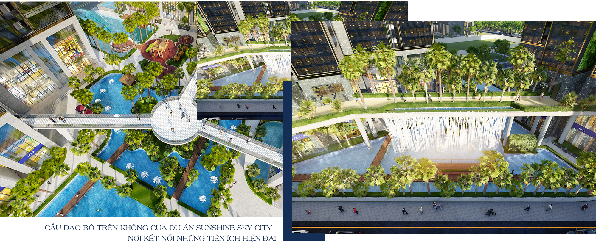 Với không gian sống xanh mát, chủ nhân căn hộ Sunshine Sky City được tận hưởng chuỗi tiện ích như một resort thu nhỏ ngay trong lòng phố. Kỳ công nhất là dòng sông nội khu liên tòa như dải lụa mềm mại giữa không gian Sunshine Sky City, cùng hòa hợp với hệ thống đường dạo bộ ven sông và cầu đi bộ trên không khiến nơi đây trở thành điểm hẹn đầy chất thơ cho những người yêu thiên nhiên. Có thể nghe tiếng nước chảy đêm ngày, hòa cùng với gió trời len lỏi giữa những tán cây khiến mỗi người đều phiêu giữa thiên nhiên xanh mát ngay trong lòng thành phố.