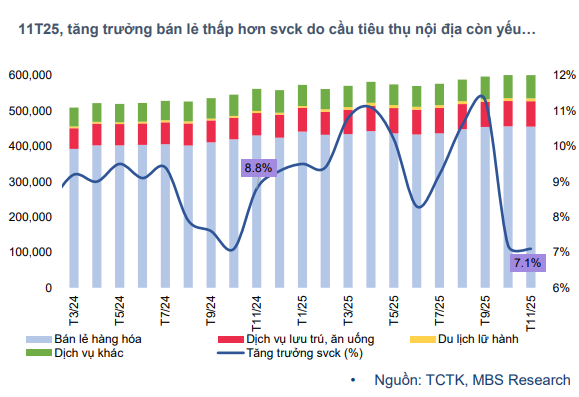 Theo MBS, tăng trưởng tiêu dùng trong năm 2025 vẫn ở mức khá yếu khi giá cả nhiều nhóm hàng hóa tăng cao trong khi thu nhập của người lao động chưa có sự cải thiện rõ rệt. Áp lực chi phí sinh hoạt khiến người tiêu dùng có xu hướng thắt chặt chi tiêu, ưu tiên các khoản mua sắm thiết yếu và trì hoãn tiêu dùng các sản phẩm có giá trị cao.