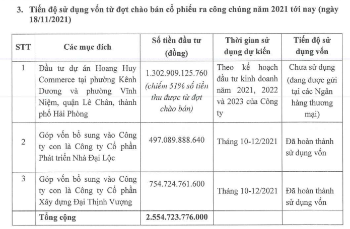 Việc góp vốn vào 2 đơn vị này đã được TCH hoàn tất thực hiện vào tháng 10/2021. Còn tiền đầu tư vào dự án Hoàng Huy Commerce vẫn chưa được sử dụng, đang được gửi tại các Ngân hàng Thương mại.