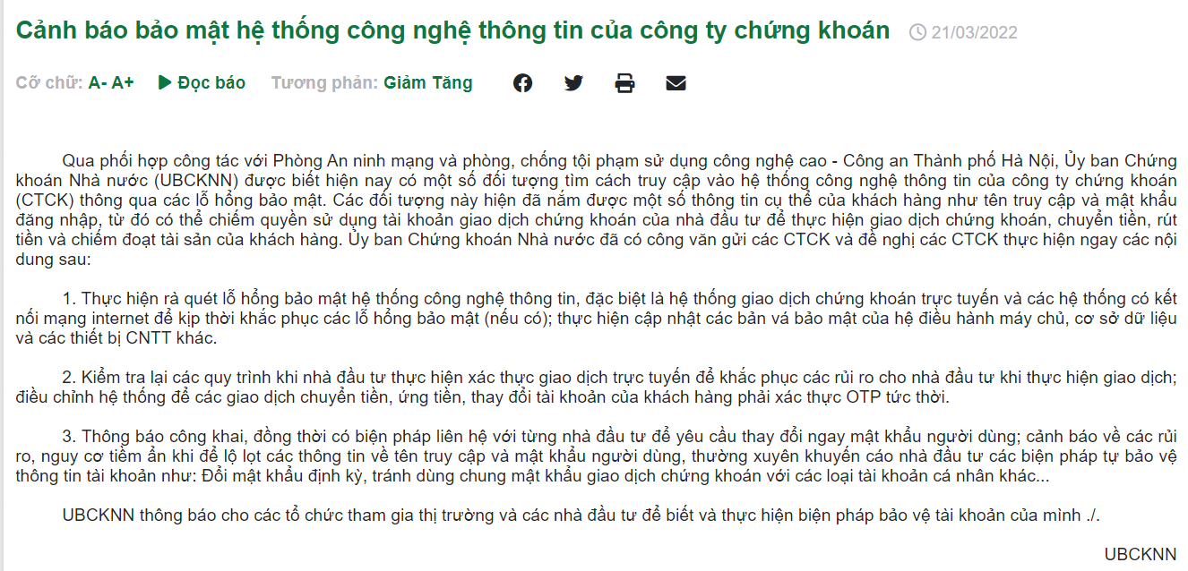 Trước đó hồi cuối tháng 3/2023, UBCKNN đã phát đi cảnh báo bảo mật hệ thống công nghệ thông tin của công ty chứng khoán.