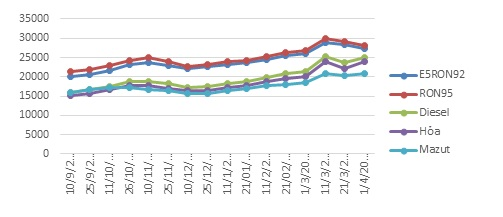 Bình quân giá thành phẩm xăng dầu thế giới giữa kỳ điều hành giá xăng dầu ngày 21/3/2022 và kỳ điều hành ngày 01/4/2022 là: 126,837 USD/thùng xăng RON92 dùng để pha chế xăng E5RON92 (tăng 4,93 USD/thùng, tương đương tăng 4,04% so với kỳ trước); 130,550 USD/thùng xăng RON95 (tăng 4,71 USD/thùng, tương đương tăng 3,74% so với kỳ trước; 140,557 USD/thùng dầu hỏa (tăng 20,15 USD/thùng, tương đương tăng 16,73% so với kỳ trước); 140,727 USD/thùng dầu điêzen (tăng 18,39 USD/thùng, tương đương tăng 15,03% so với kỳ trước); khoảng 679,128 USD/tấn dầu mazut 180CST 3,5S (tăng 54,04 USD/tấn, tương đương tăng 8,64% so với kỳ trước).