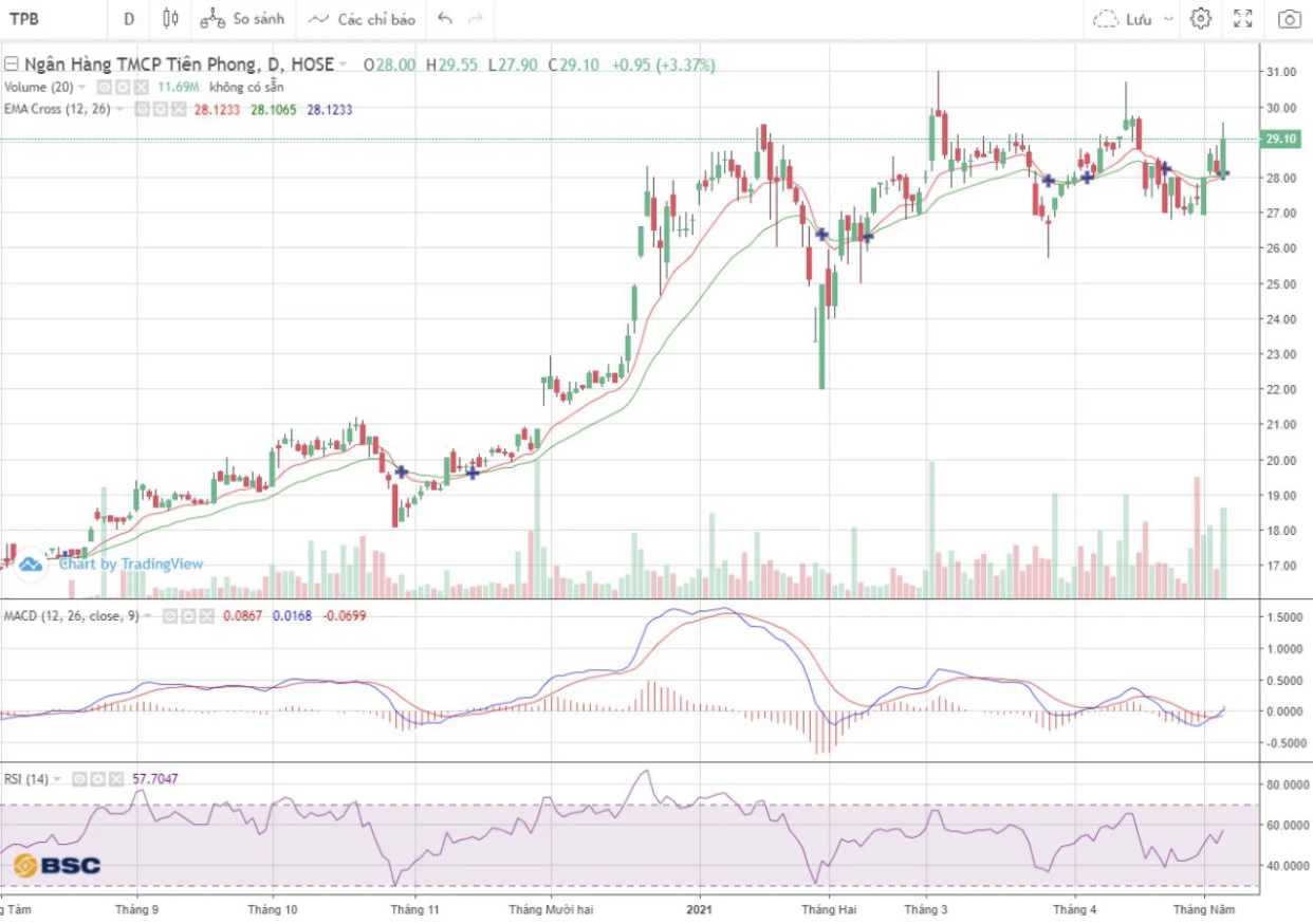 TPB đang ở trạng thái tích lũy trung hạn tại khu vực 27 - 30 trong hơn 2 tháng trở lại đây. Thanh khoản cổ phiếu trong những phiên gần đây vẫn giữ giá trị ổn định. Các chỉ báo xu hướng hiện đang ở trong trạng thái khả quan.