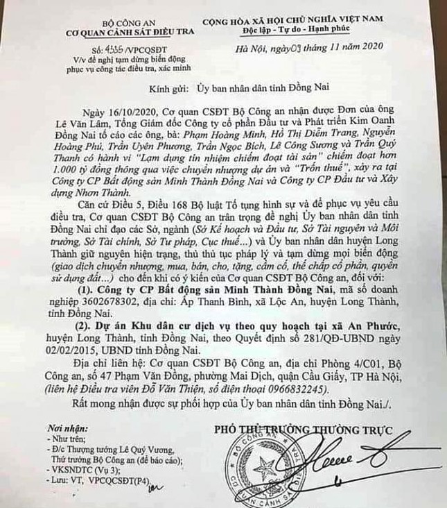 Bộ Công an đề nghị UBND tỉnh Đồng Nai chỉ đạo các Sở, ngành và UBND huyện Long Thành giữ nguyên hiện trạng, thủ tục pháp lý và tạm dừng mọi biến động (giao dịch chuyển nhượng, mua, bán, cho, tặng, cầm cố, thế chấp cổ phẩn, quyền sử dụng đất…) với Công ty CP bất động sản Minh Thành Đồng Nai ở ấp Thanh Bình, xã Lộc An, huyện Long Thành và Dự án khu dân cư dịch vụ theo quy hoạch tại xã An Phước, huyện Long Thành, tỉnh Đồng Nai.
