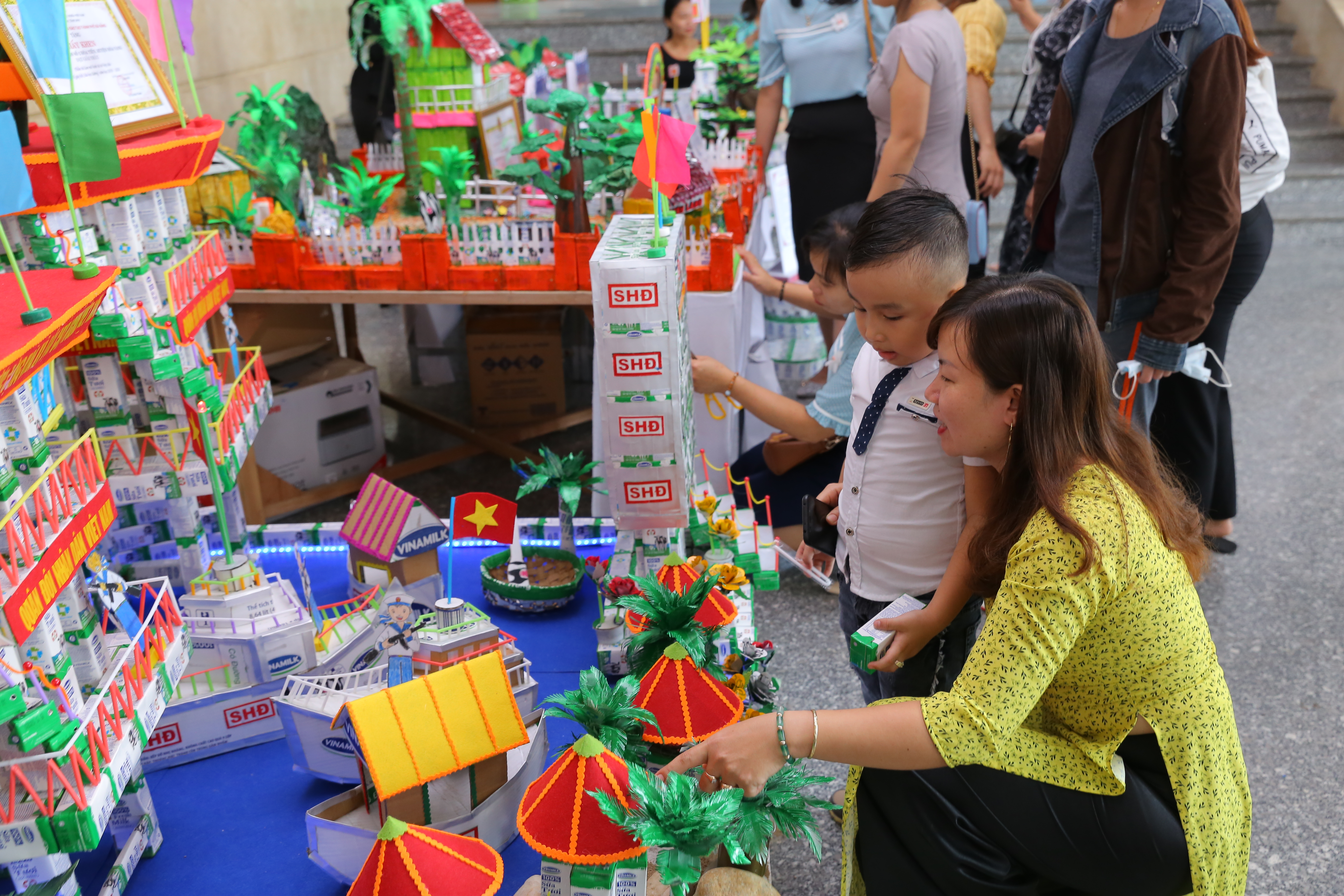 Cô giáo và các em học sinh bên cạnh những mô hình làm từ vỏ hộp sữa trong chương trình SHĐ